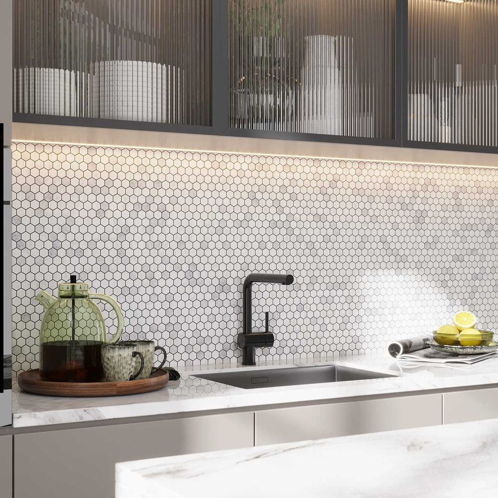 Add a touch of luxury to your kitchen with our White Carrara Polished Hexagon Marble Mosaic. The 1-inch hexagonal shape exudes elegance, and the polished finish highlights the natural veining of the marble. Elevate your kitchen design with this stunning mosaic for a timeless aesthetic.
