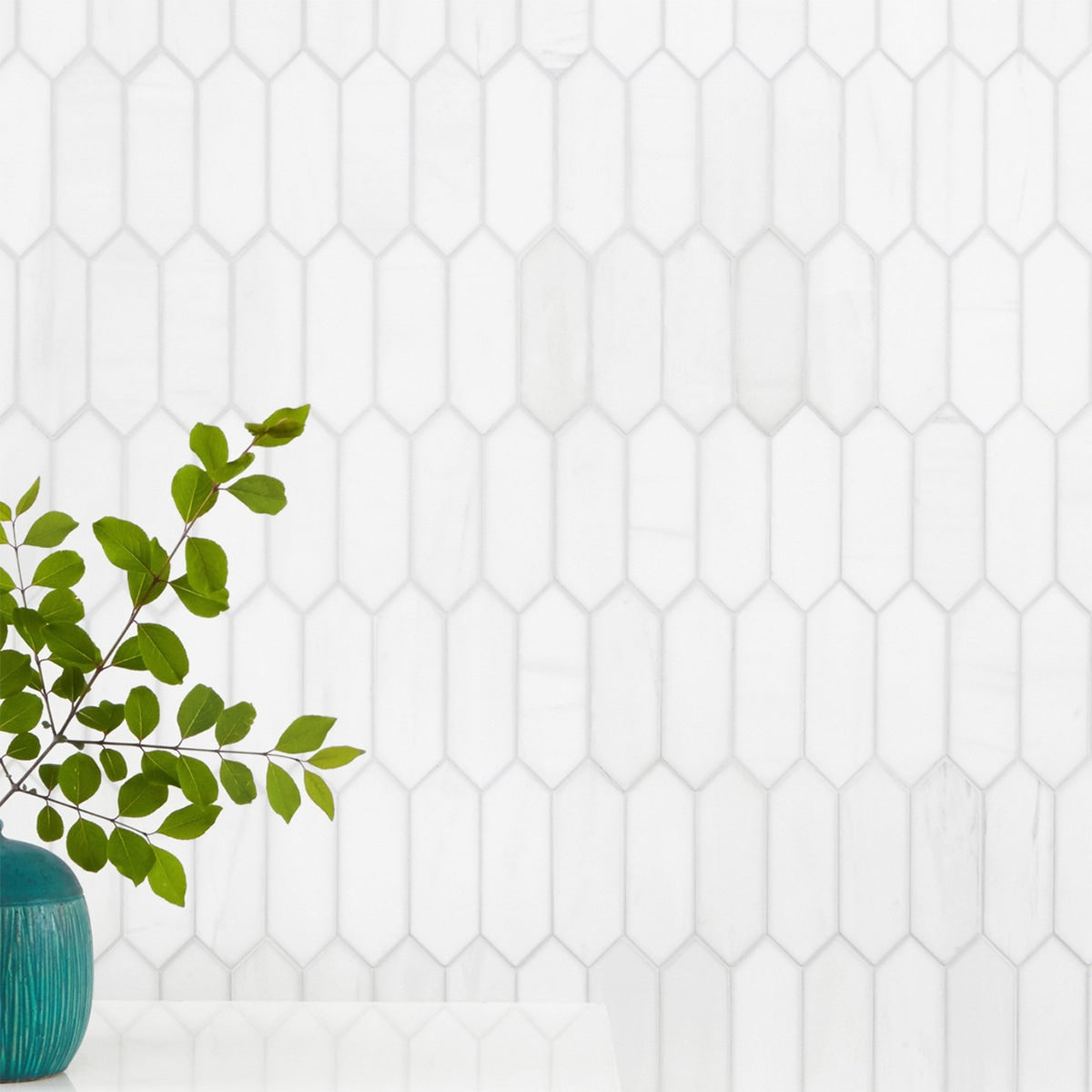 Make a statement in your kitchen with our Bianco Dolomiti Polished Picket Marble Mosaic. The unique picket shape adds a contemporary flair, while the polished finish enhances the natural beauty of the marble. Create a stunning backsplash or focal point with this distinctive and stylish mosaic.