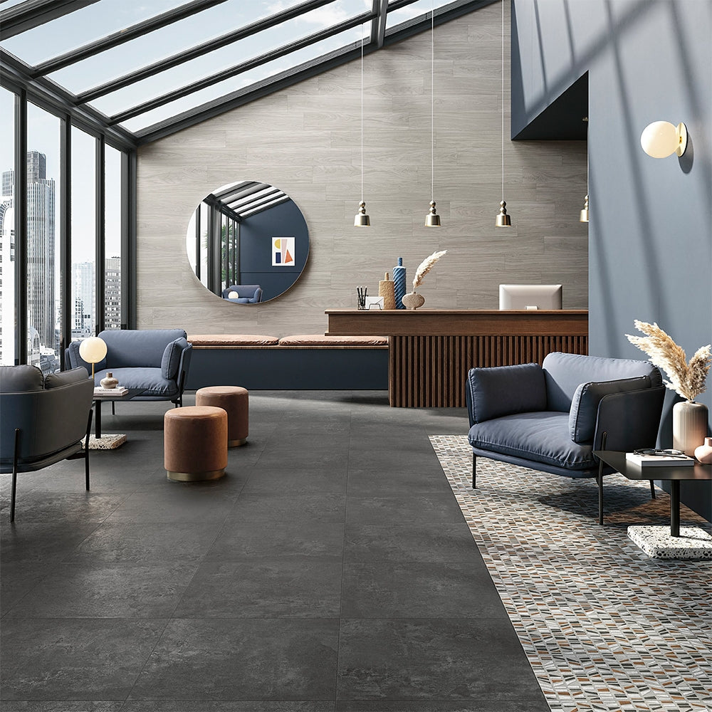 For a space with depth and character, consider the Archivio Oscuro Matte 24x24 Porcelain Tile. Its dark and dramatic appearance captures the essence of a cement-infused interior. Ideal for creating a moody and stylish atmosphere in your home.