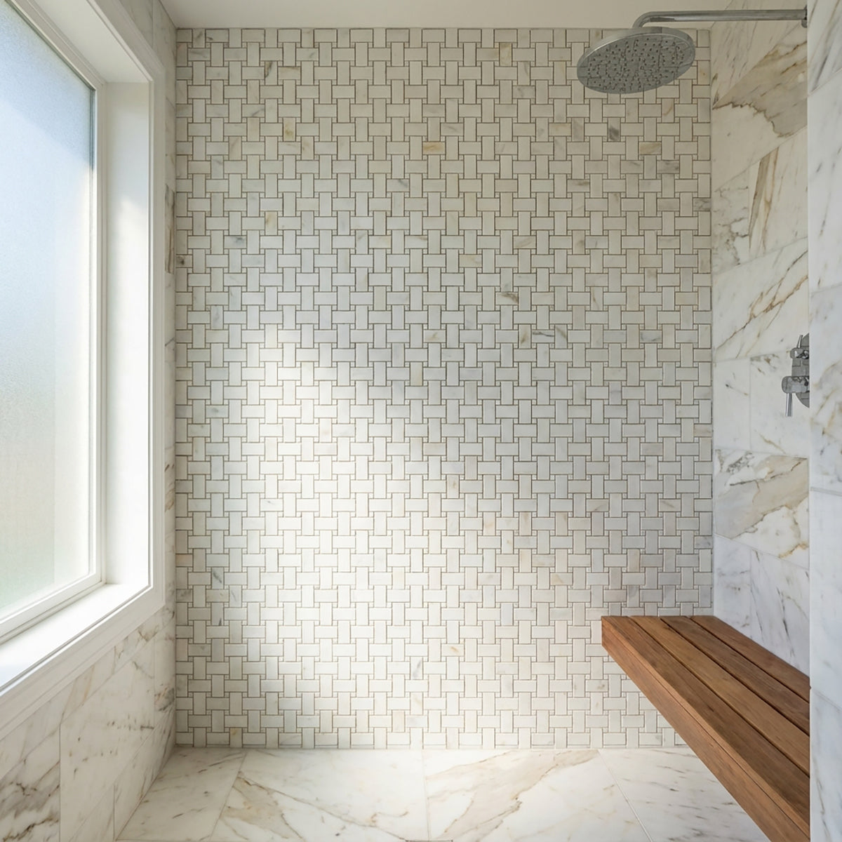 Enhance your design project with the timeless beauty of our Calacatta Honed Basket Weave Marble Mosaic. Featuring a honed finish and a classic 1x2-inch basket weave pattern, this mosaic tile adds sophistication and elegance to any space. Whether used as a backsplash, accent wall, or shower surround, it creates a stunning focal point that will elevate your interior.