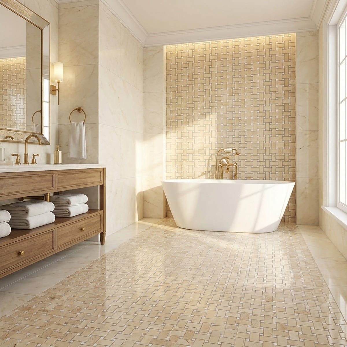 Enhance your design with the timeless allure of our Crema Marfil Polished Marble Mosaic in a 1x2 basket weave format. With its polished finish and classic crema marfil color, this marble mosaic exudes sophistication. Whether installed as a shower accent, backsplash, or floor detail, it creates a stunning visual impact that elevates your space.
