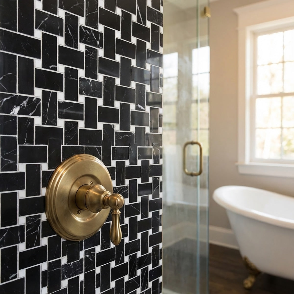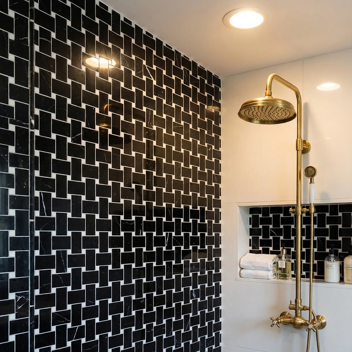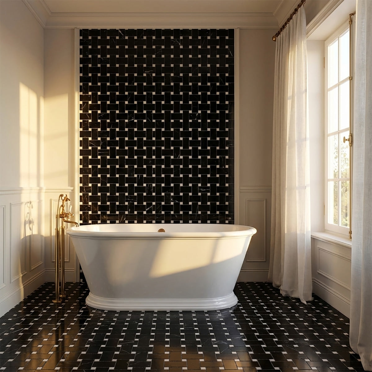 Infuse your design with classic charm using the Nero Marquina & Thassos White Polished 1x2 Basket Weave Marble Mosaic. The polished finish and basket weave pattern create a timeless look, making it perfect for various applications, including walls, floors, and backsplashes. This exquisite mosaic redefines elegance with its refined beauty and enduring appeal, ideal for both traditional and contemporary interiors. Elevate your space with the luxurious charm of this stunning marble mosaic.