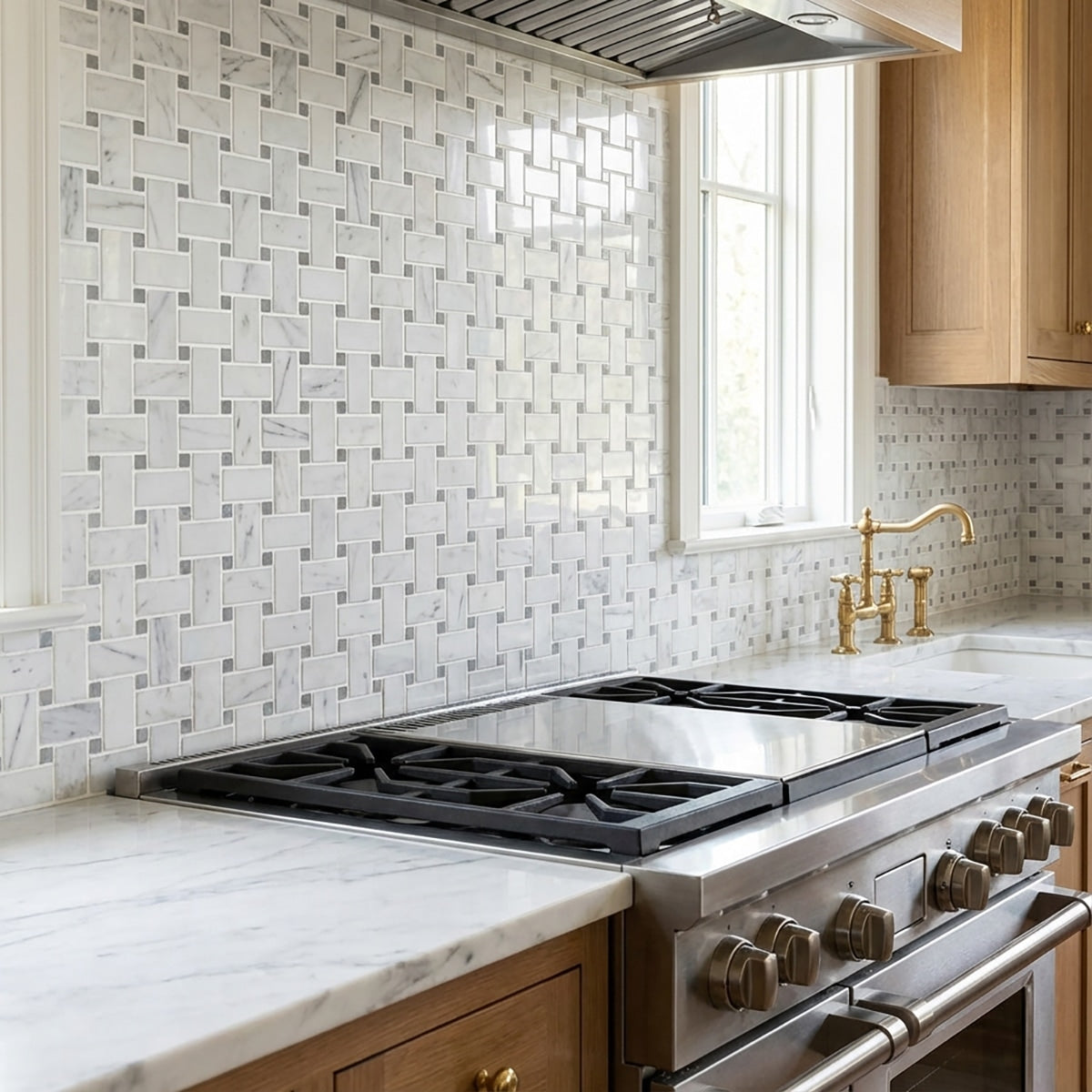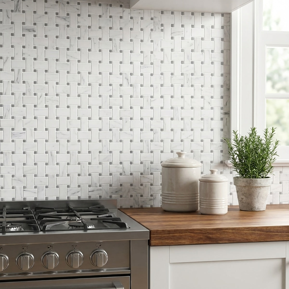 Elevate your interior with White Carrara Polished 1x2 Basket Weave W1 Marble Mosaic. Its polished finish and quality marble construction ensure a classic and elegant design.