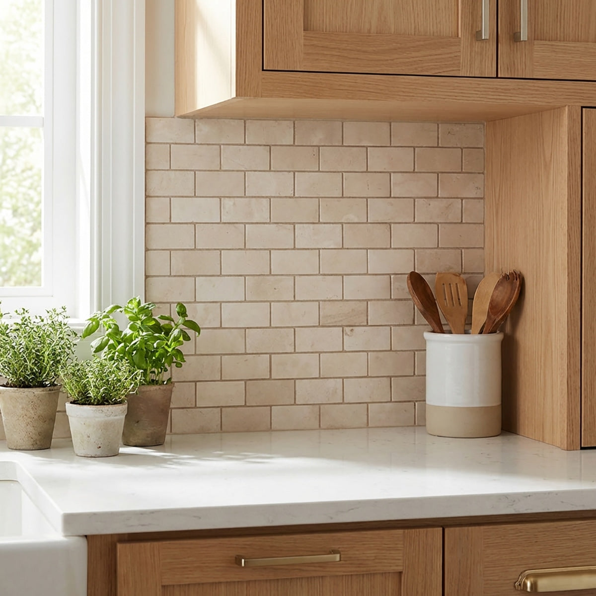 The Aero Cream Honed 1x2 Brick Marble Mosaic delivers a modern twist on a classic design. The brick pattern and honed matte finish showcase the creamy tones and fine veining of the marble, offering a soft and elegant texture. Perfect for backsplashes, shower walls, or accent pieces, this mosaic adds visual interest and timeless beauty to any space. Its versatile design suits both contemporary and traditional interiors.