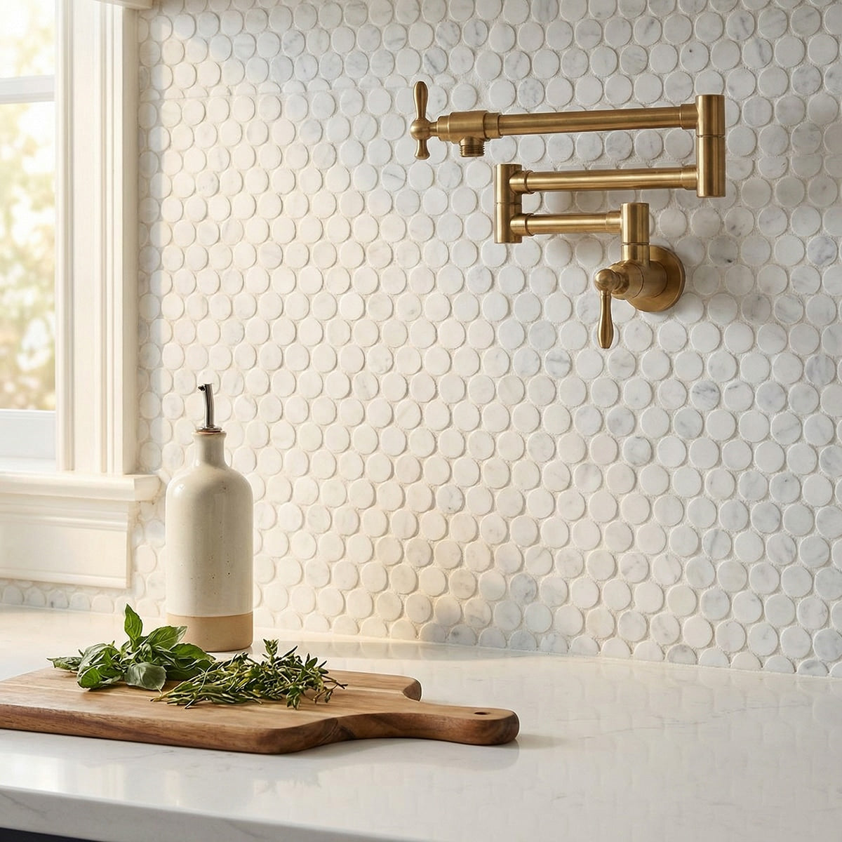 Add a touch of luxury to your space with our White Carrara Honed Penny Round Marble Mosaic. This exquisite marble mosaic features a honed finish and a classic white carrara color, creating a timeless look. Whether used on floors or walls, it adds elegance and charm to any interior.
