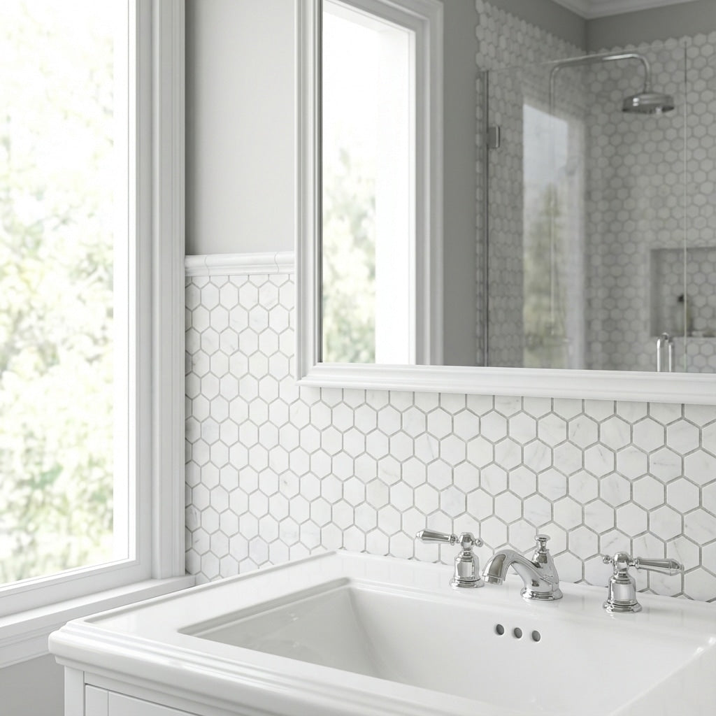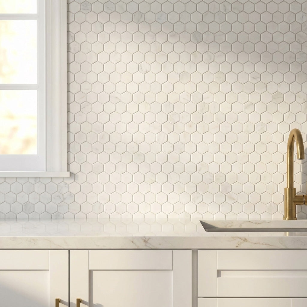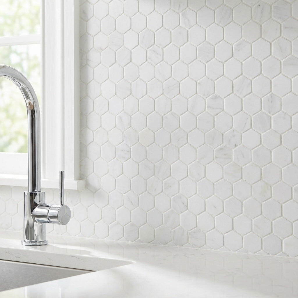 Enhance your space with the timeless elegance of Bianco Dolomiti Honed 1 Inch Hexagon Marble Mosaic. The honed finish and hexagon pattern create a classic and sophisticated look for walls, floors, or backsplashes. This versatile and stylish marble mosaic elevates your design with its refined beauty and enduring charm, making it ideal for both traditional and contemporary interiors. Transform your space with the luxurious appeal of this exquisite marble mosaic.