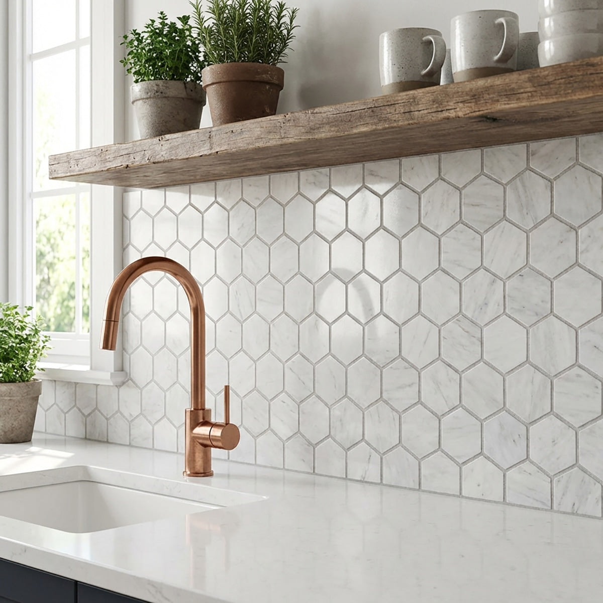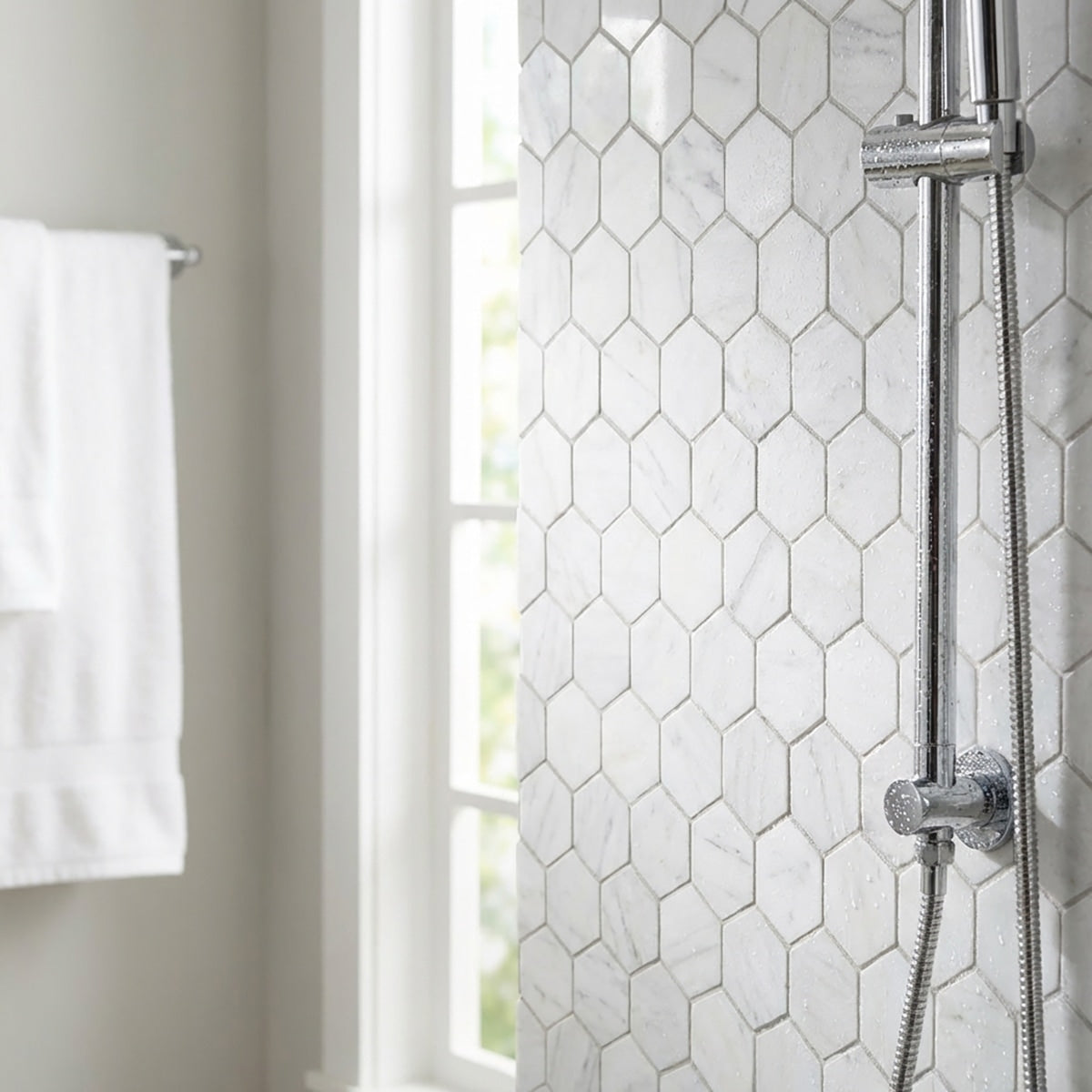 Transform your space with the understated beauty of Bianco Dolomiti Honed 3 Inch Hexagon Marble Mosaic. The honed finish and hexagon pattern add a touch of elegance to walls, floors, or backsplashes. This sophisticated marble mosaic achieves a sleek and modern look, enhancing your interiors with its refined charm and timeless beauty. Elevate your design with the luxurious appeal of this exquisite marble mosaic.