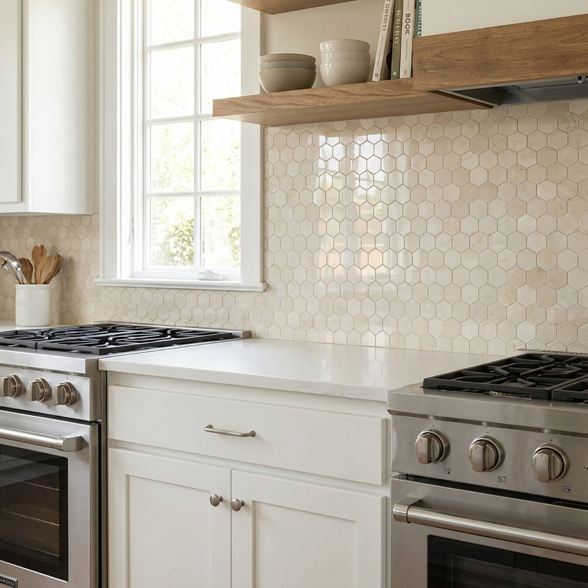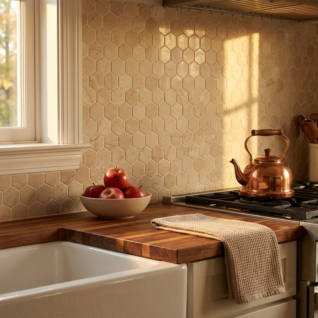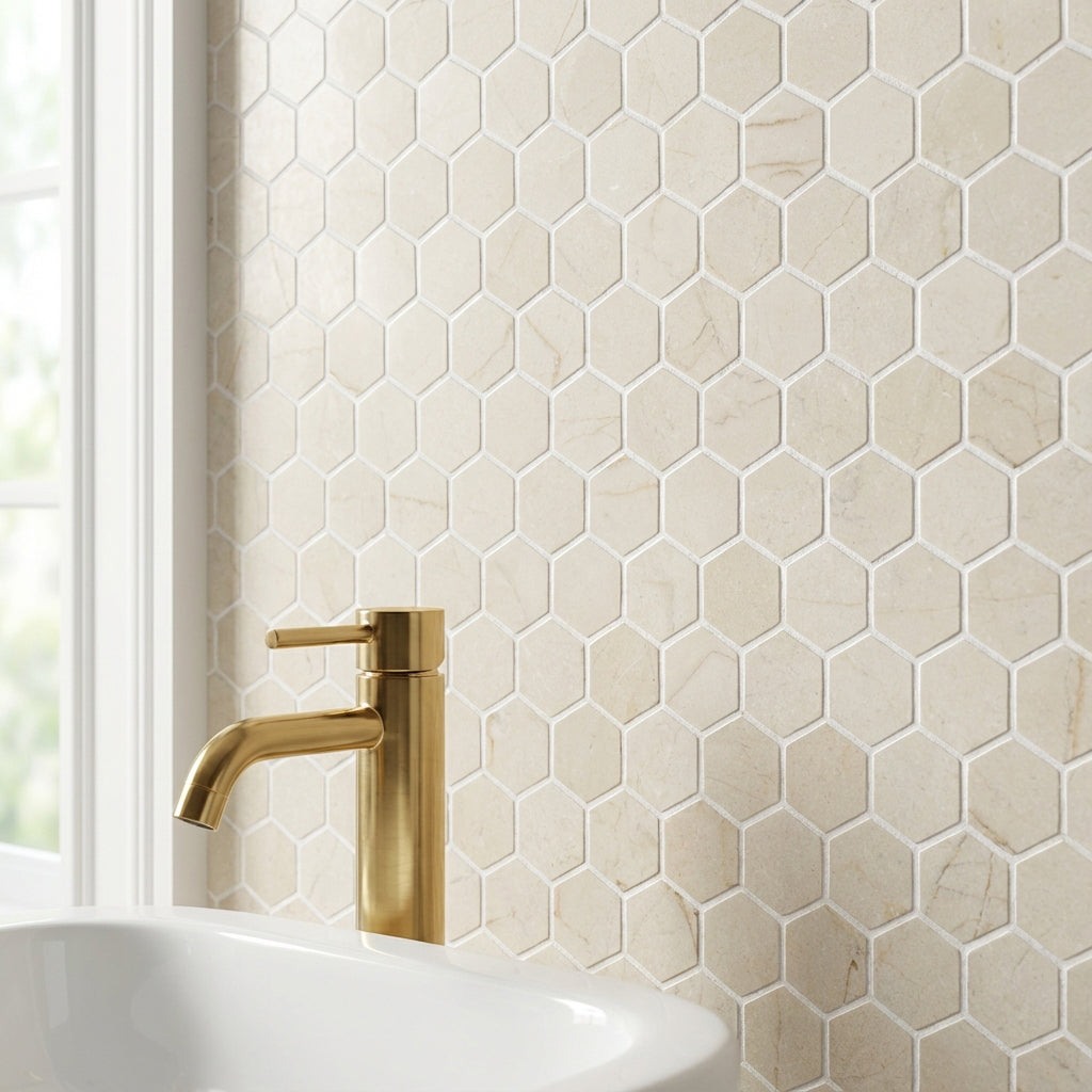 Craft a sleek and sophisticated interior with Crema Marfil Honed 1 Inch Hexagon Marble Mosaic. The honed finish and quality marble construction provide a distinctive and timeless design.