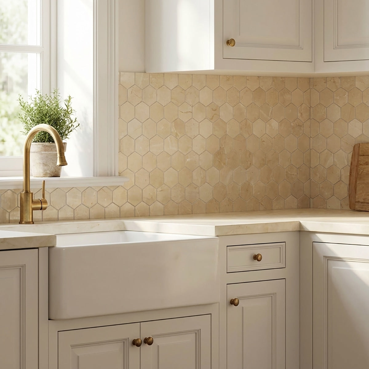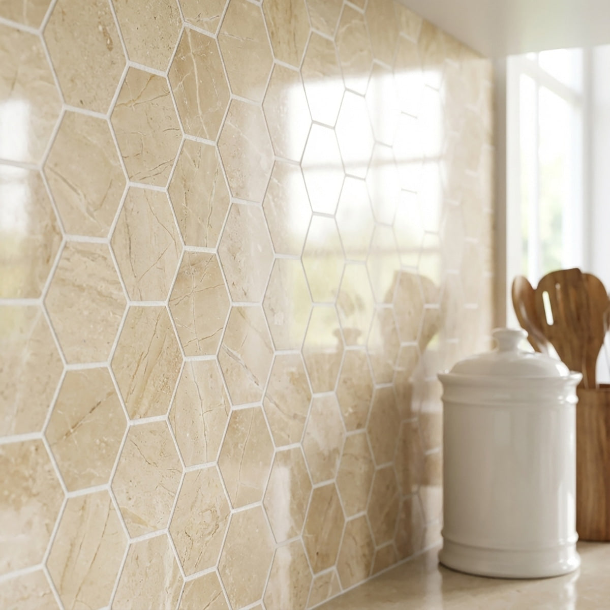 Add a touch of luxury to your space with our Crema Marfil Polished Marble Mosaic in a 2-inch hexagon format. With its polished finish and classic crema marfil color, this marble mosaic brings elegance to any design. Whether used in bathrooms, kitchens, or entryways, it creates a timeless look that enhances your interior.