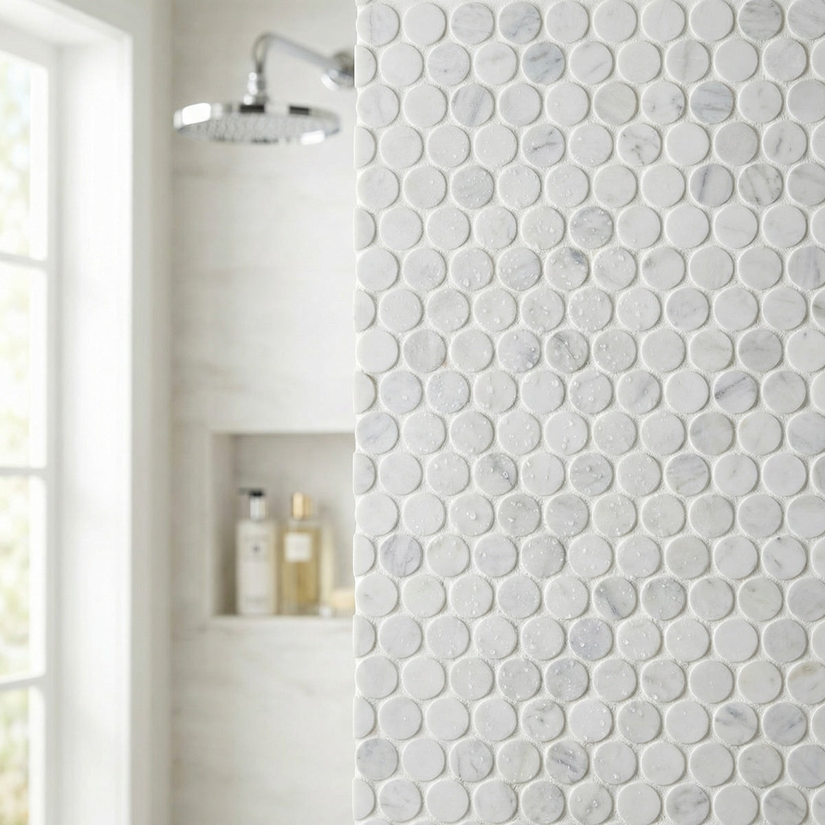 Add a touch of elegance to your space with our Calacatta Honed Penny Round Marble Mosaic. This exquisite mosaic tile features a honed finish and a classic penny round shape, creating a timeless look. Whether used as a backsplash, accent wall, or shower surround, it adds sophistication and charm to any design project.