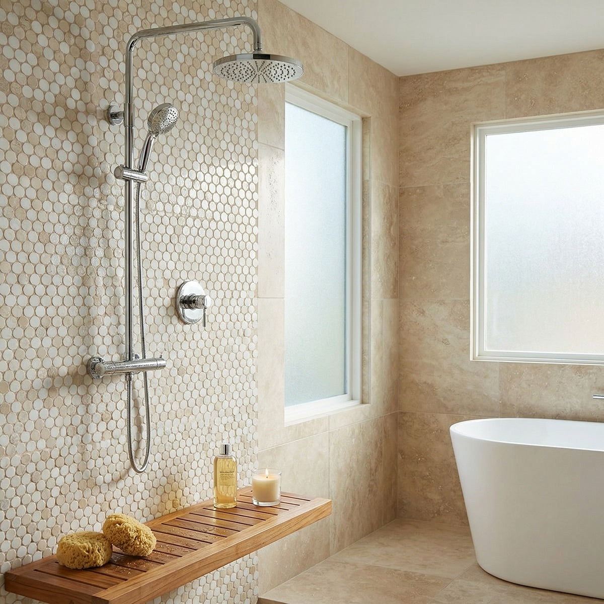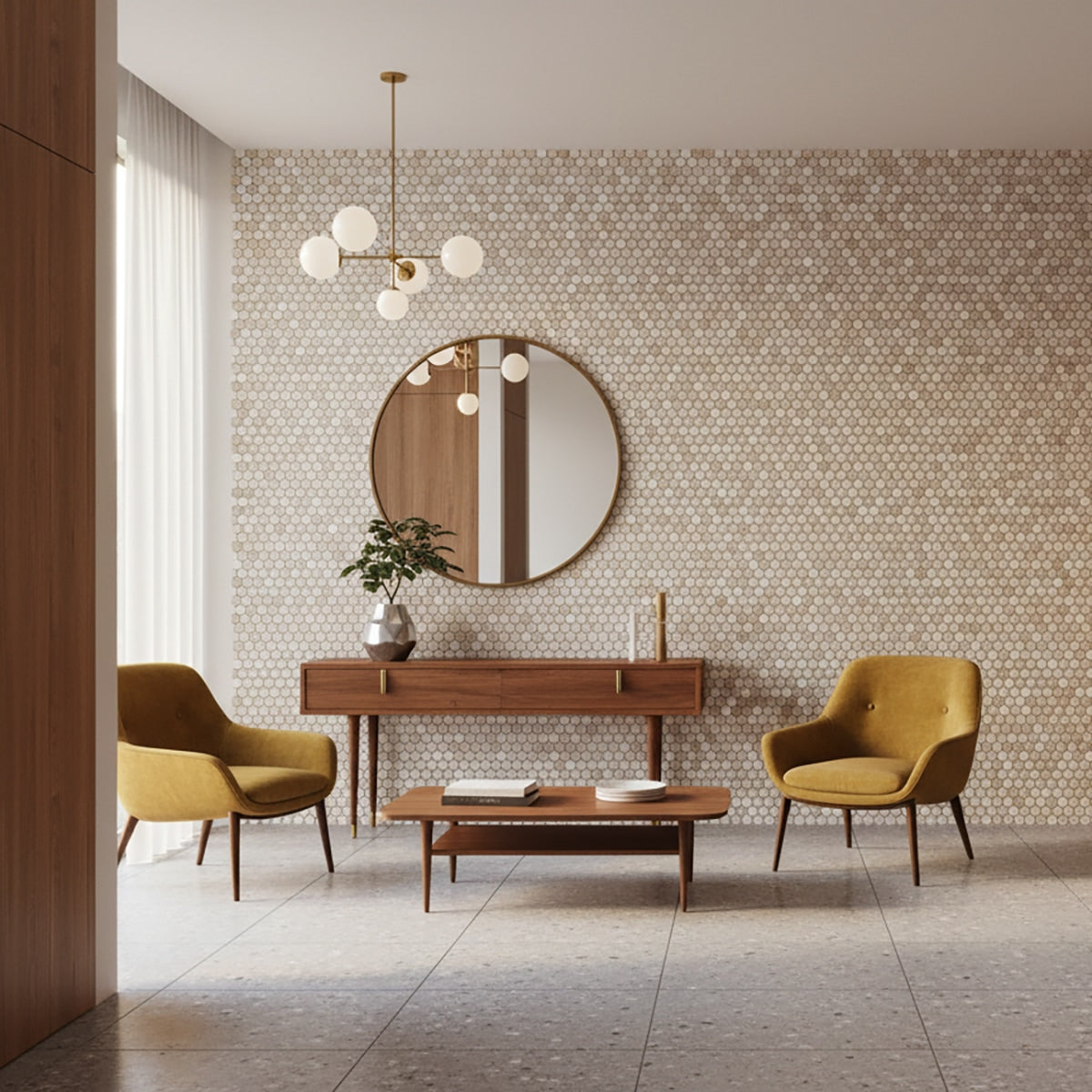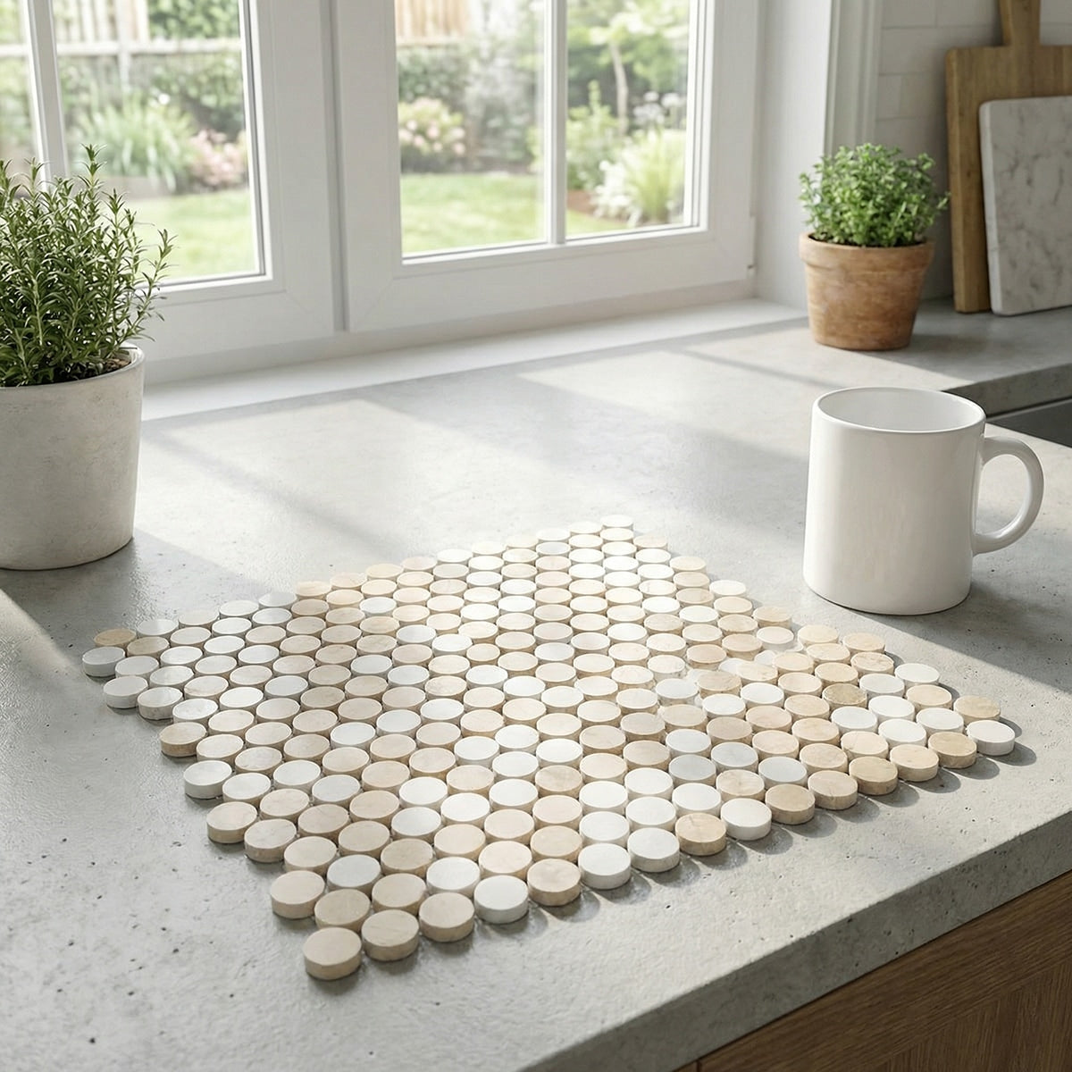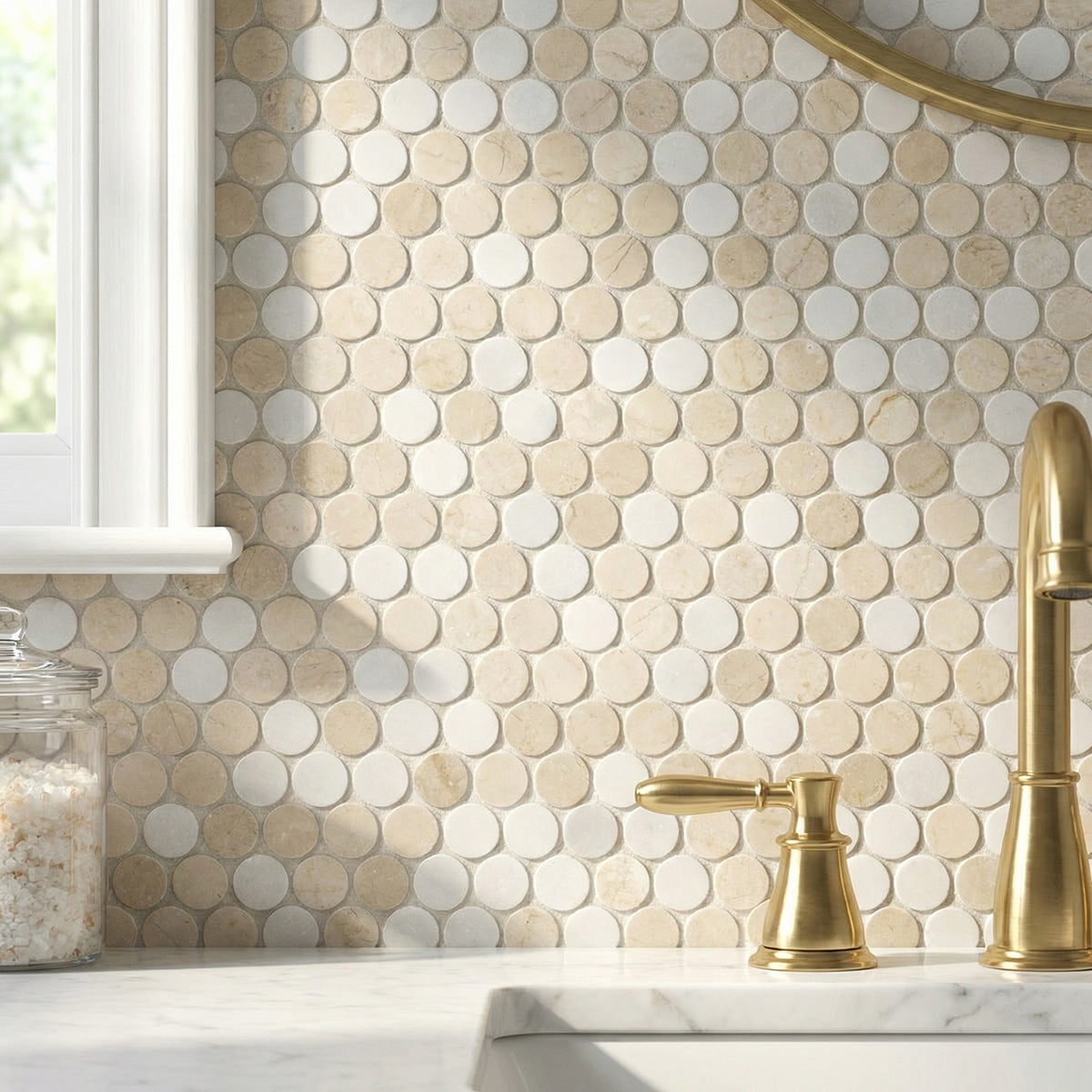 Create a modern and elegant interior with Crema Marfil Honed Multi Penny Round Marble Mosaic. Its honed finish and quality marble material offer a sleek and timeless design.