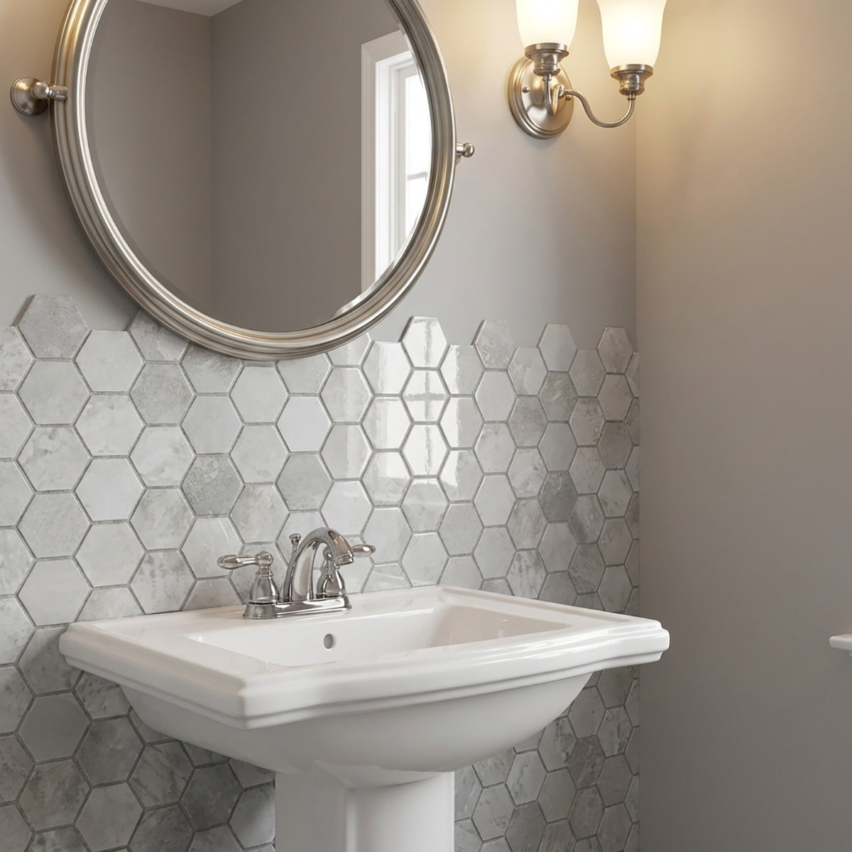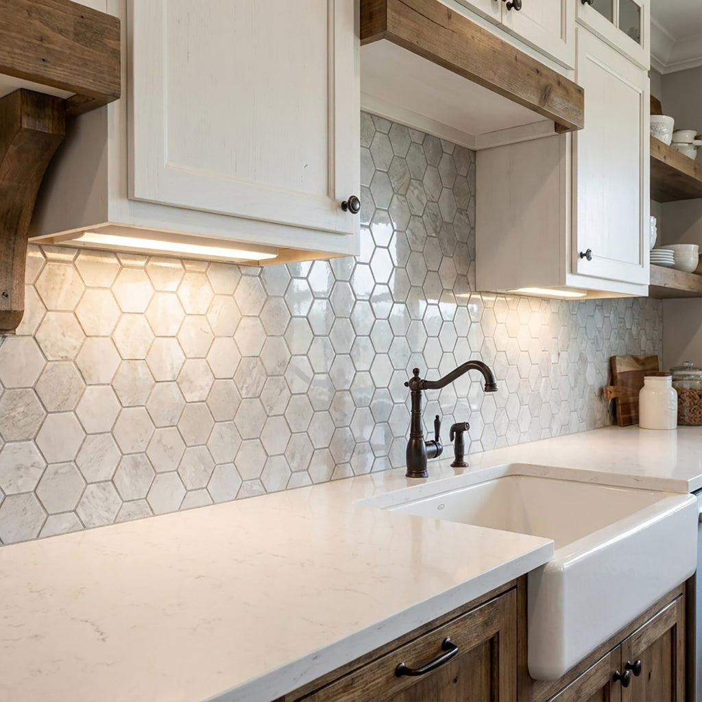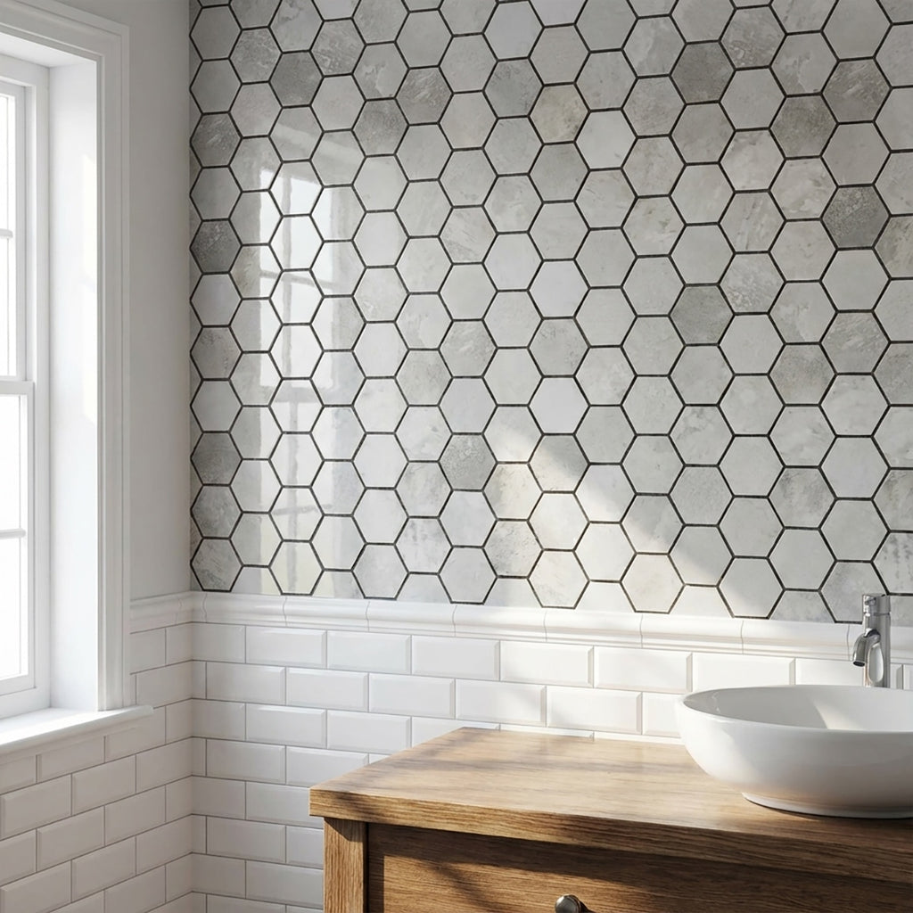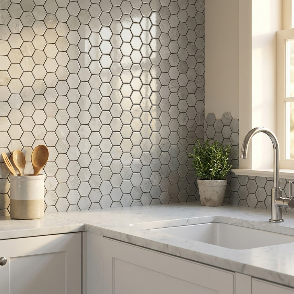 Elevate your space with the captivating allure of our Silver Diamond Glossy porcelain mosaic tile. Featuring a glossy finish and unique 2-inch hexagon shape, this mosaic tile adds visual interest to any surface. Whether used for backsplashes, shower floors, or accent walls, its elegant design enhances any interior.