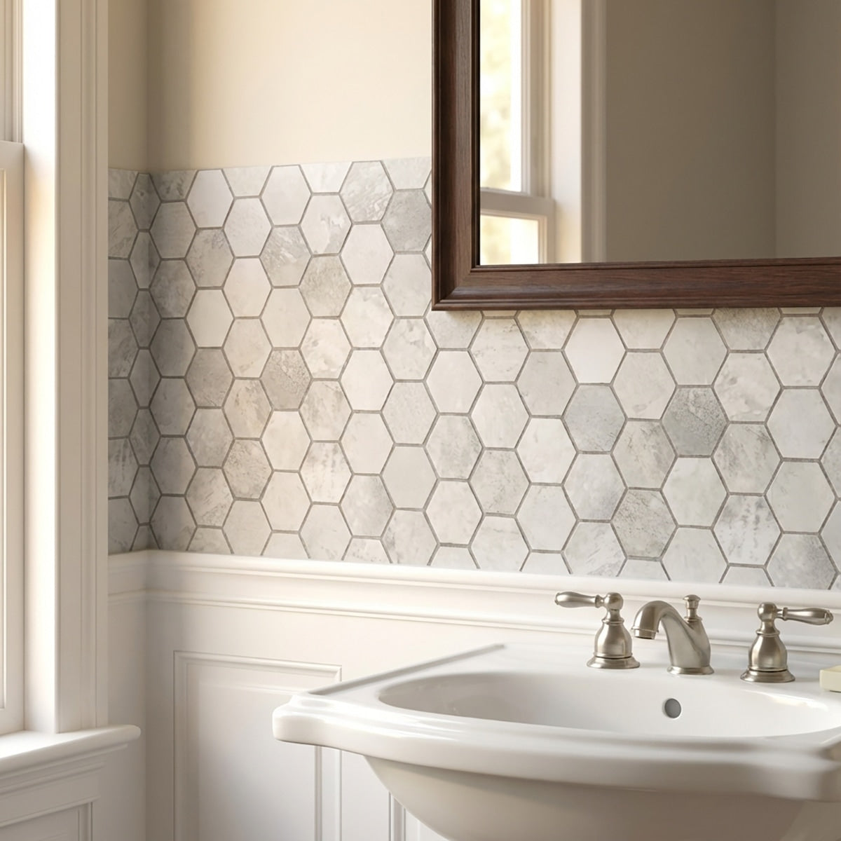 Introducing our Silver Diamond Matte porcelain mosaic tile, a stylish choice for enhancing your space. With its matte finish and distinctive 2-inch hexagon shape, this mosaic tile offers a modern twist on classic design. Perfect for creating dynamic backsplashes or shower floors, its versatility adds character to any room.