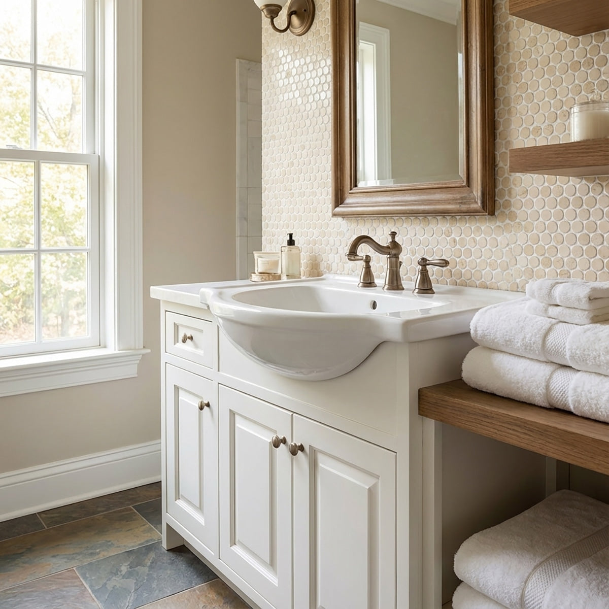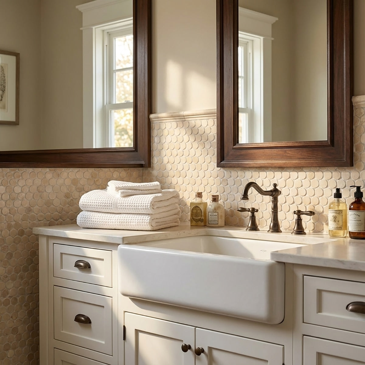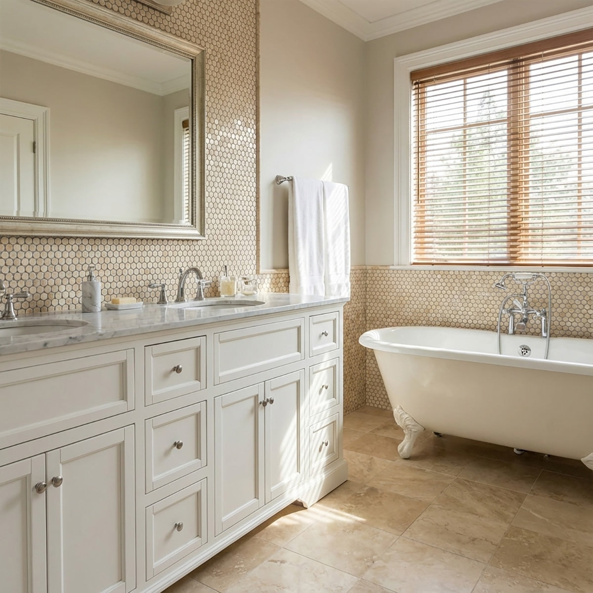 Enhance your interior with the classic charm of Crema Marfil Honed Penny Round Marble Mosaic. The honed finish and quality marble construction ensure a versatile and elegant look.