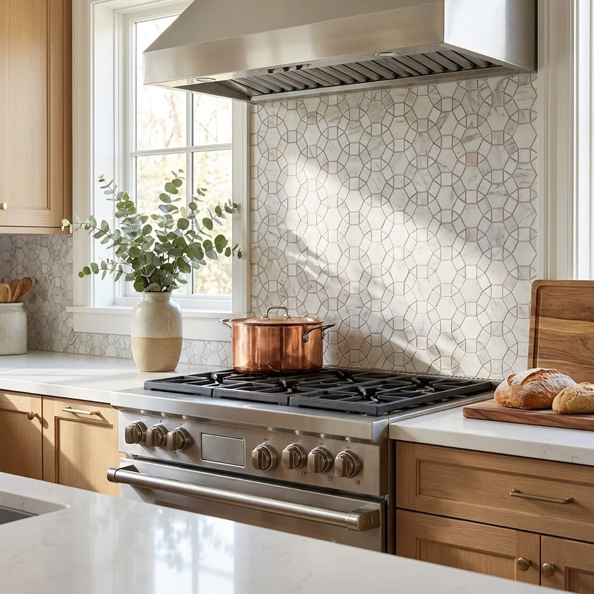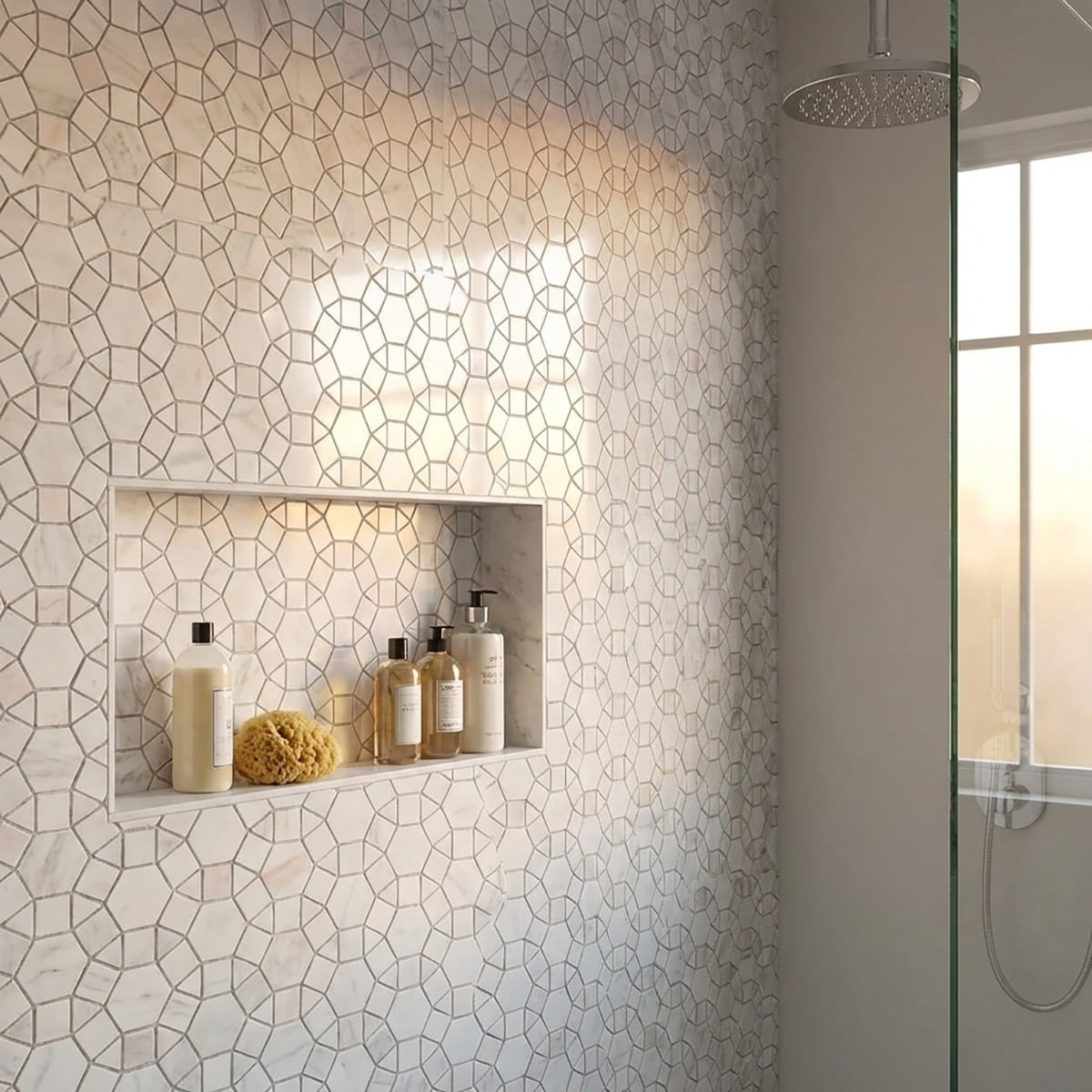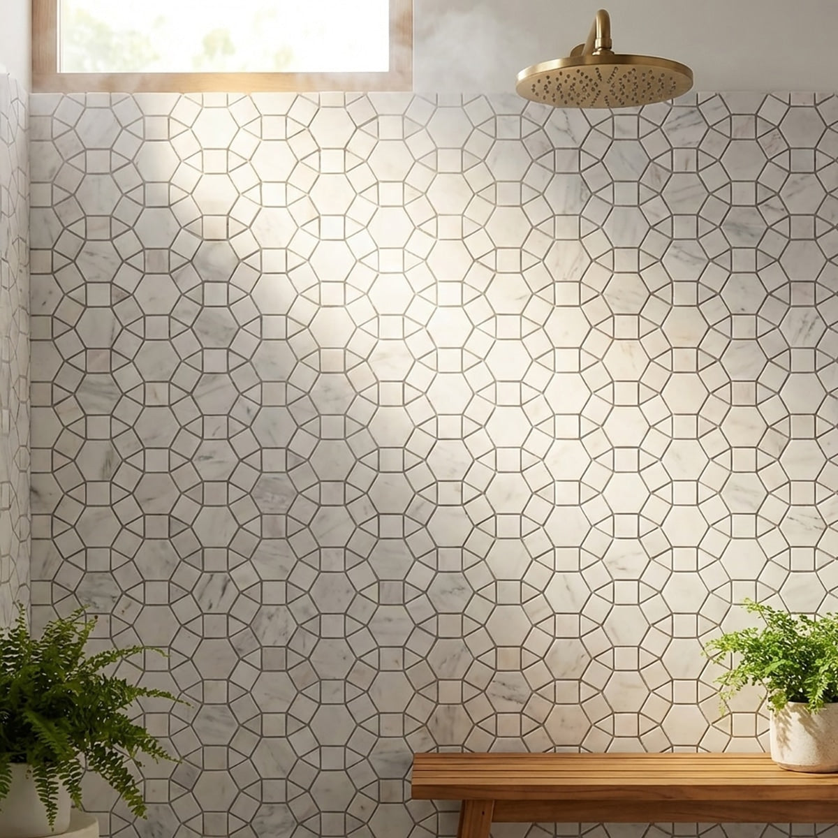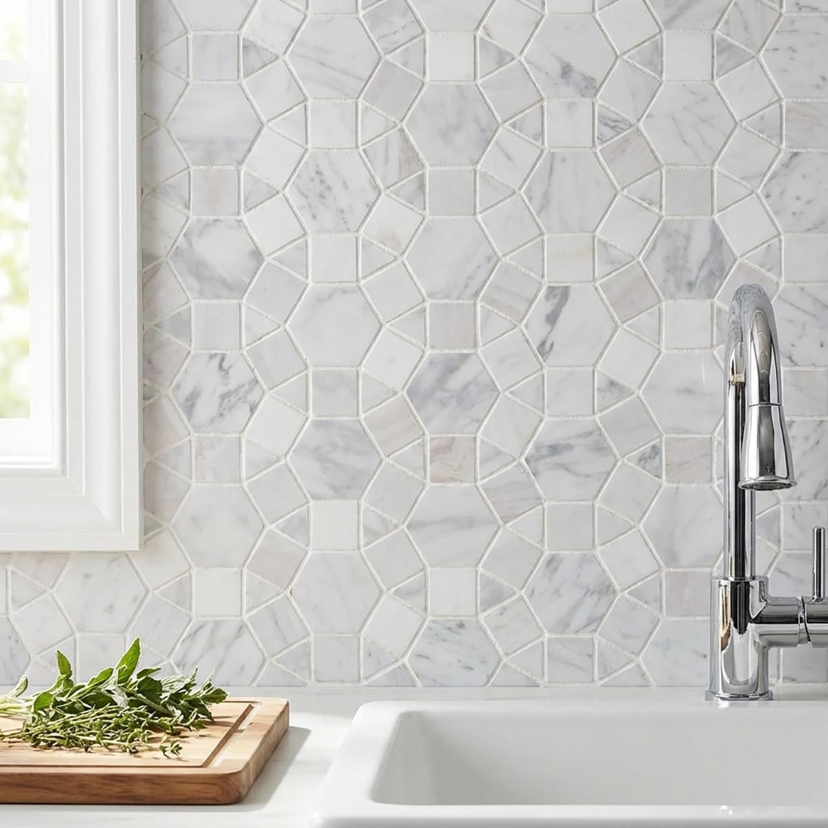 Rockart White Polished 12x12 Kaleidoscope Marble Mosaic Tile