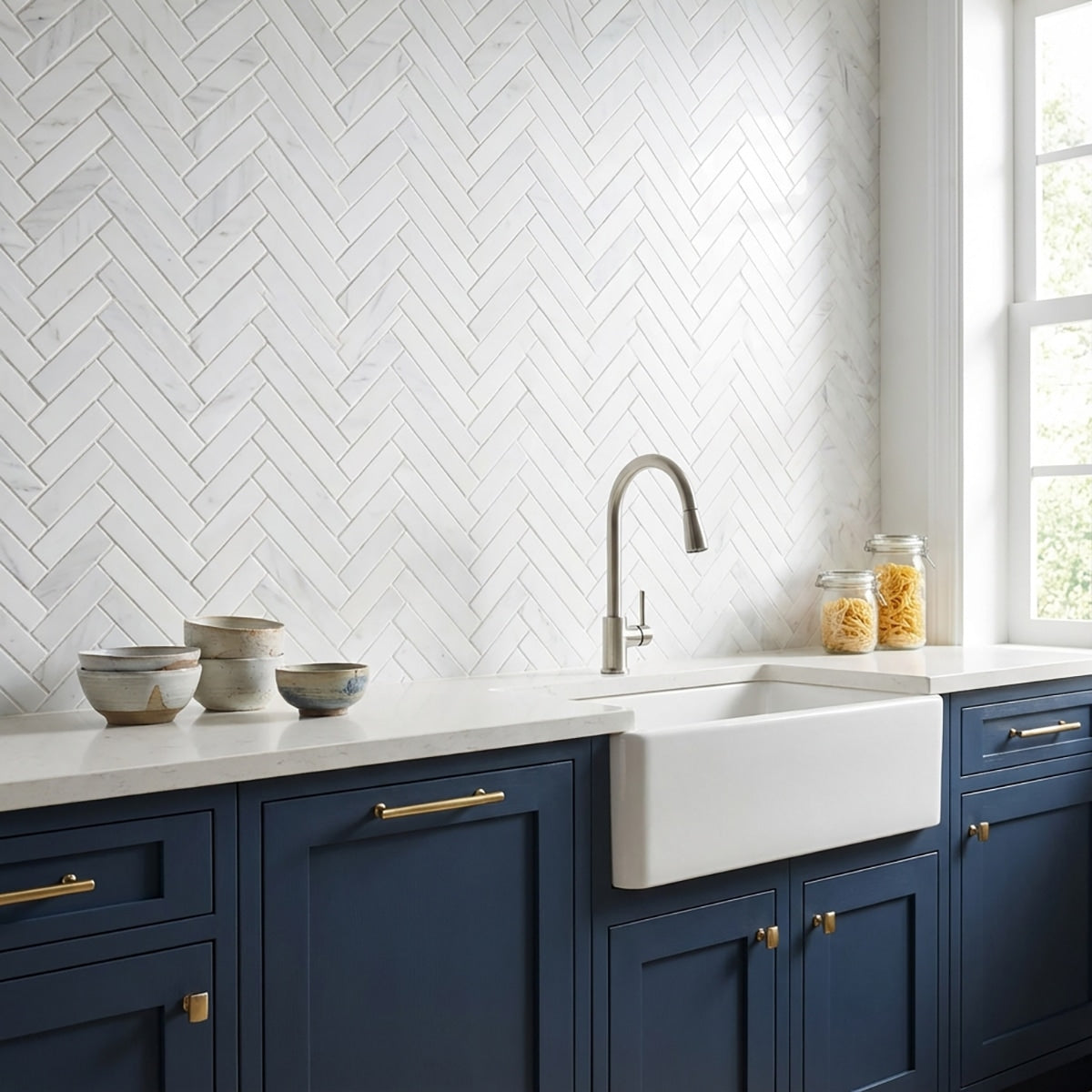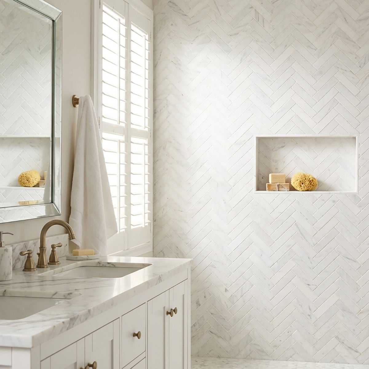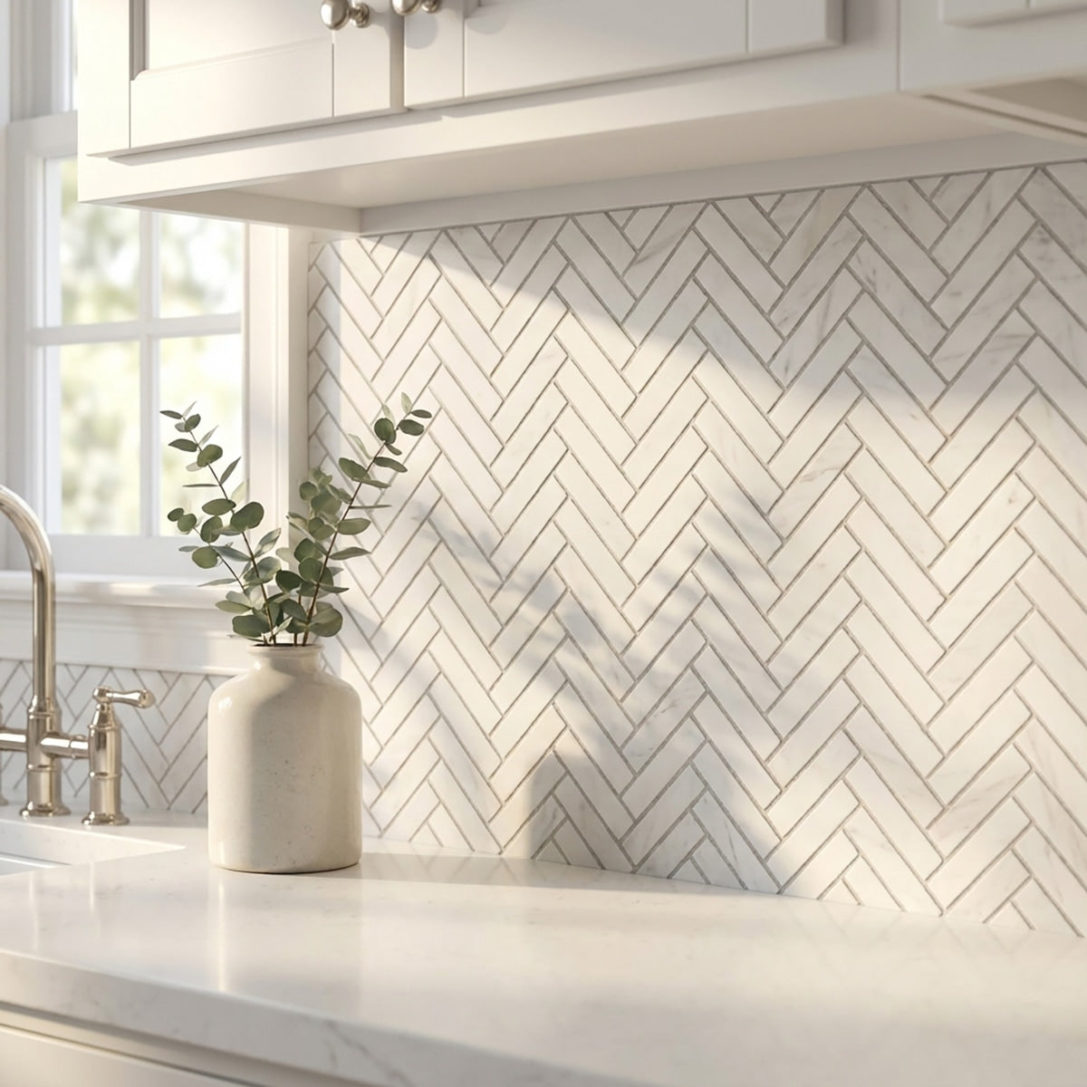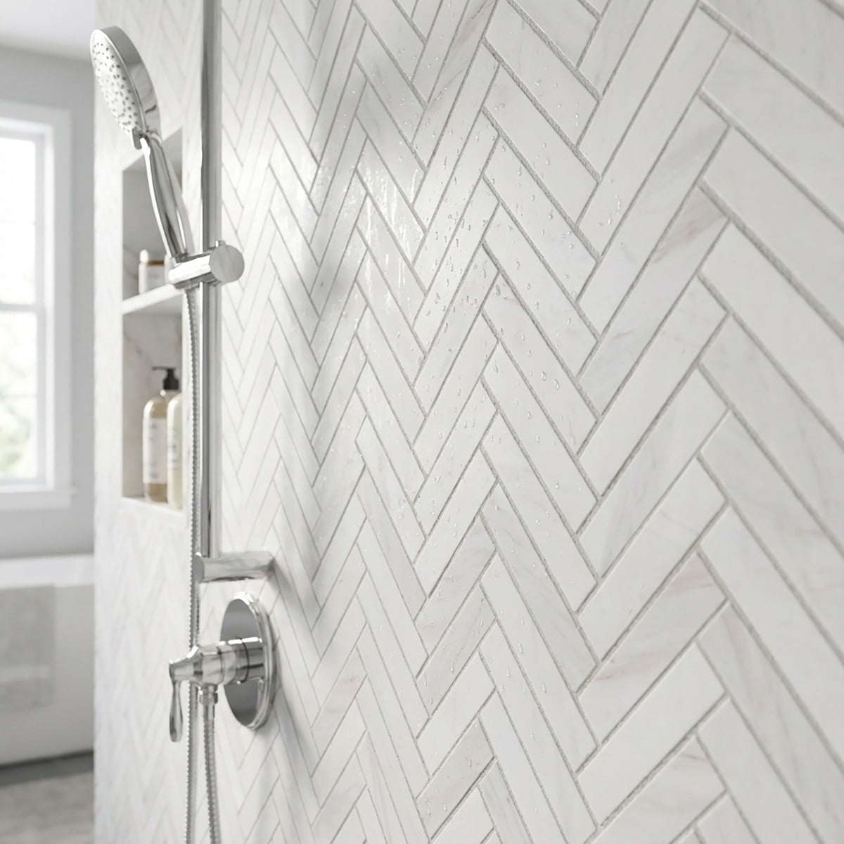Enhance your space with the classic appeal of Bianco Dolomiti Honed 1x4 Herringbone Marble Mosaic. The honed finish and herringbone pattern create a timeless and elegant look for walls, floors, or backsplashes. This versatile marble mosaic elevates your design with its refined beauty and enduring charm, making it perfect for both traditional and contemporary interiors. Transform your space with the sophisticated appeal of this exquisite marble mosaic.