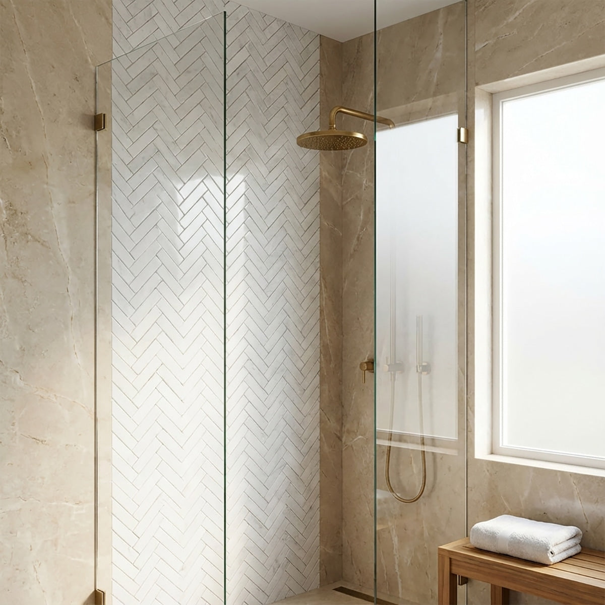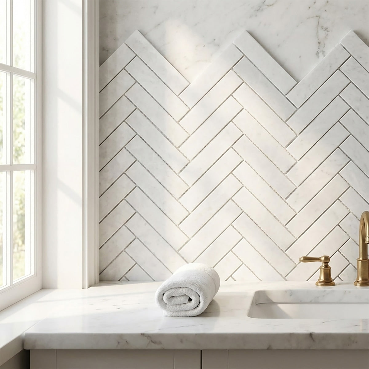 Add a touch of elegance to your space with Snow White Polished Marble Herringbone Mosaic. Crafted from premium marble in a polished finish, this mosaic features a classic herringbone pattern that adds visual interest to any surface. Whether used as flooring, wall cladding, or backsplash, its pure white color and polished surface create a luminous backdrop for your design vision.