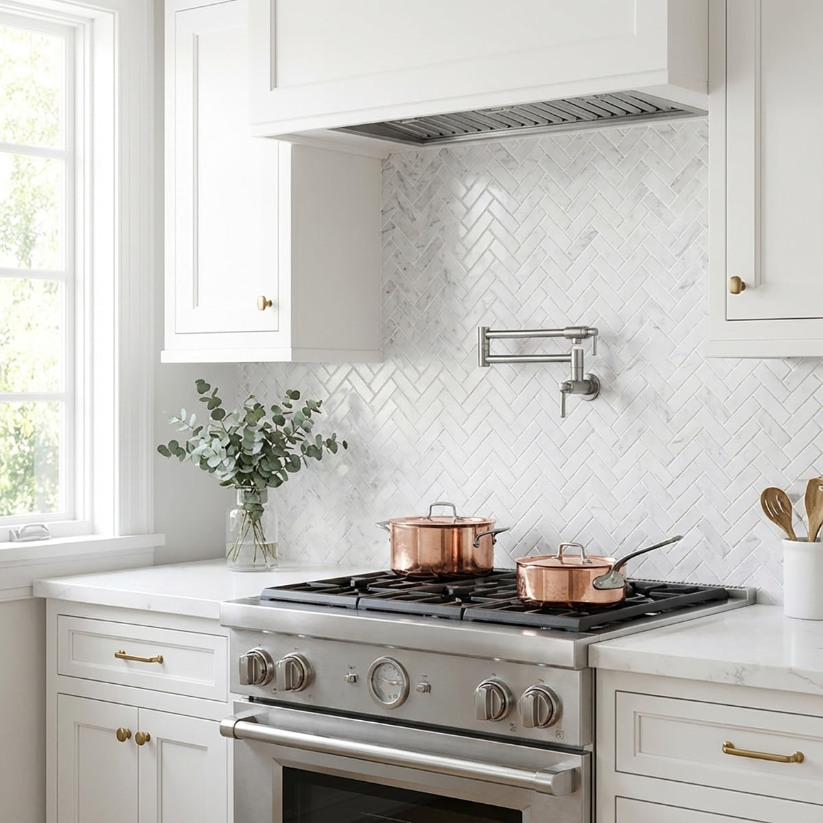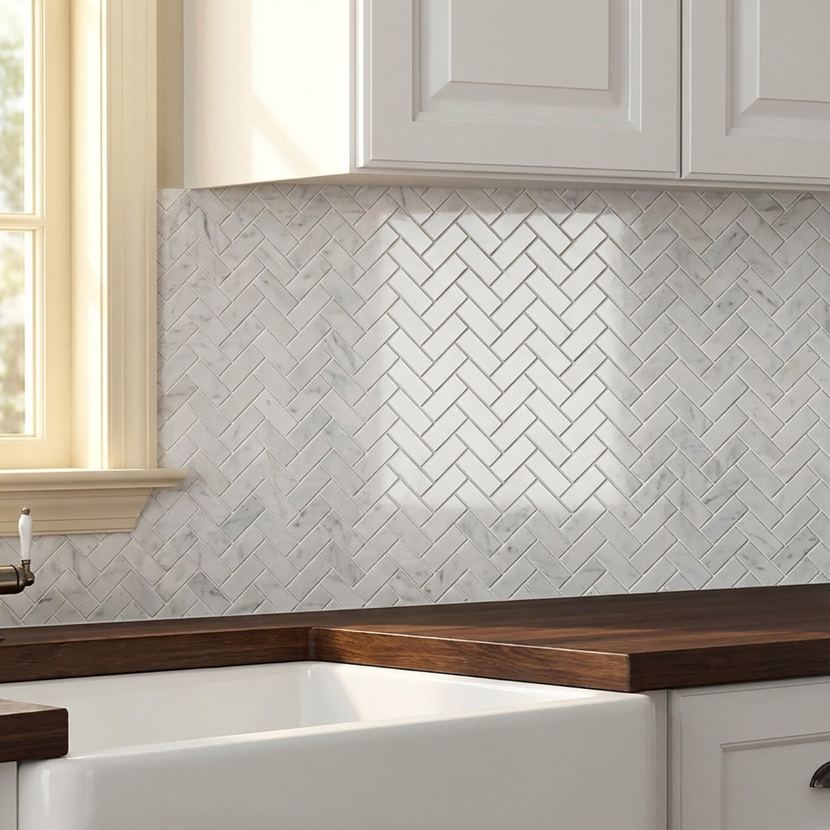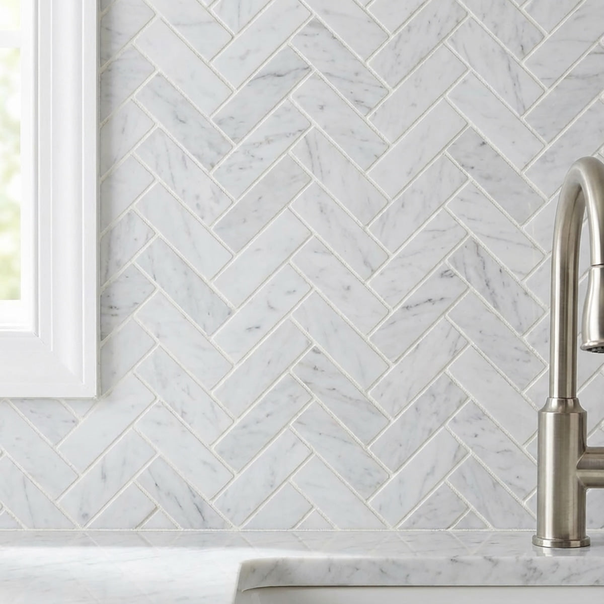 Add character to your interior with White Carrara Polished 1x3 Herringbone Marble Mosaic. The polished finish and quality marble material provide a distinctive and elegant touch.