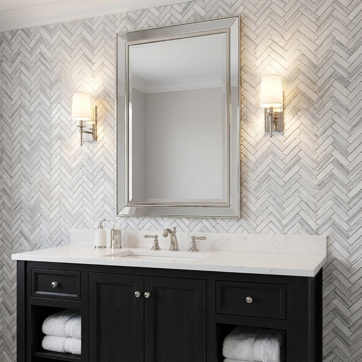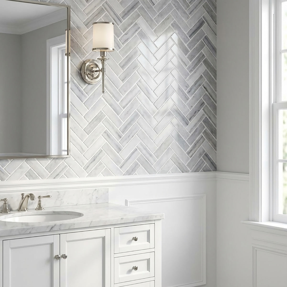 Enhance your design with the timeless beauty of the Equador Polished 1x3 Herringbone Marble Mosaic. The polished finish and herringbone pattern create a classic and elegant look, making it an ideal choice for backsplashes, walls, or floors. This artistic marble mosaic redefines sophistication with its refined beauty and enduring charm, perfect for enhancing both traditional and contemporary interiors. Elevate your space with the luxurious appeal of Equador marble.